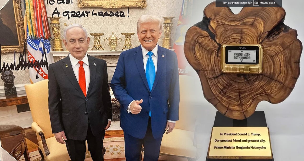 Sosyal medyada dolaşan fotoğraflarda, cihazın bir ahşap kaide üzerine monte edildiği ve yanında “Başkan Donald J. Trump’a, en büyük dostumuz ve en büyük müttefikimiz. Başbakan Binyamin Netanyahu” yazılı altın bir plaketin bulunduğu görüldü. İsrail medyası, Netanyahu’nun Trump’a ayrıca normal bir çağrı cihazı da hediye ettiğini aktardı.