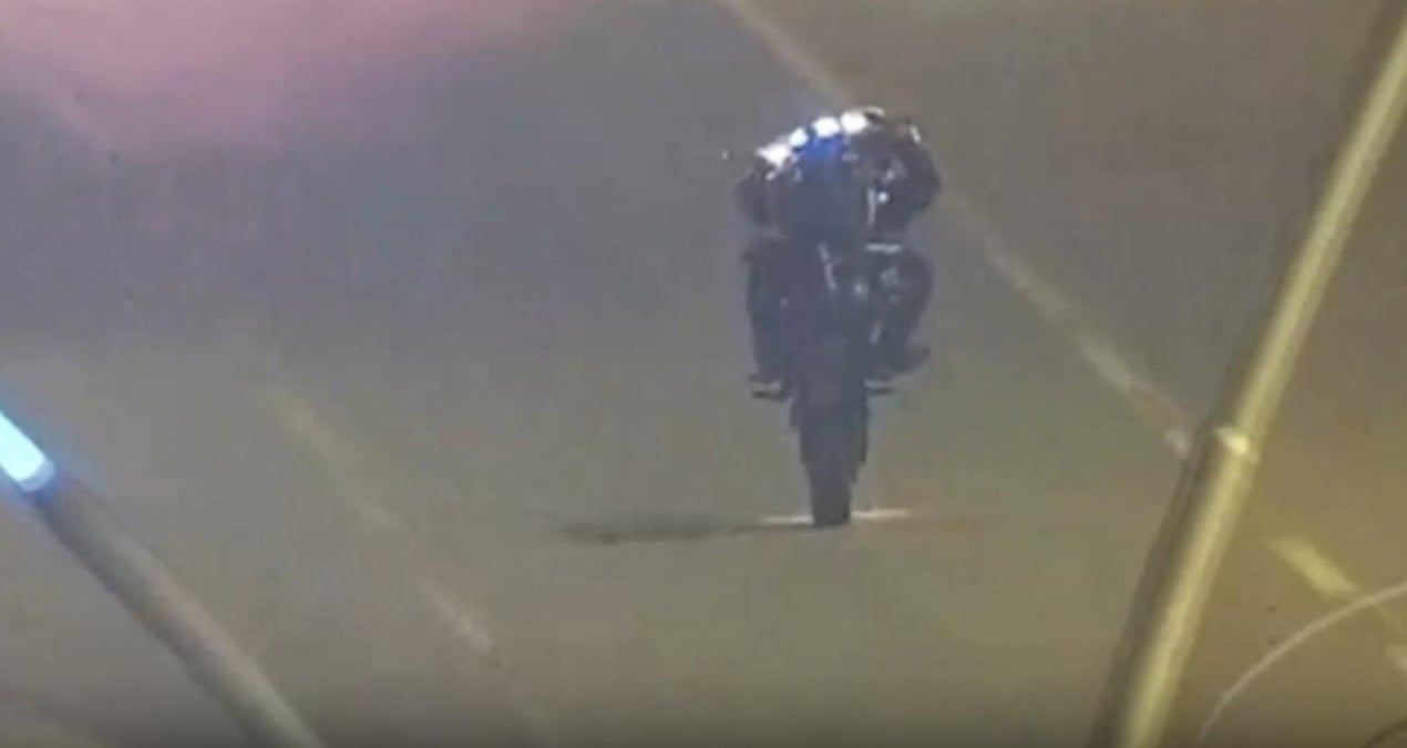 Kentte, trafiğe açık bir caddede motosikletle akrobatik hareket yapan sürücü, Kent Güvenlik Yönetim Sistemi (KGYS) kamerasınca kaydedildi.